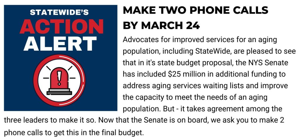 Message: My name is ___ and I am from (name your town). I am asking you to agree with the Senate’s budget proposal to fund $25 million towards implementing a portion of the Master Plan for Aging. Older New Yorkers need the Governor’s support to ensure they can age in their community of choice with dignity.